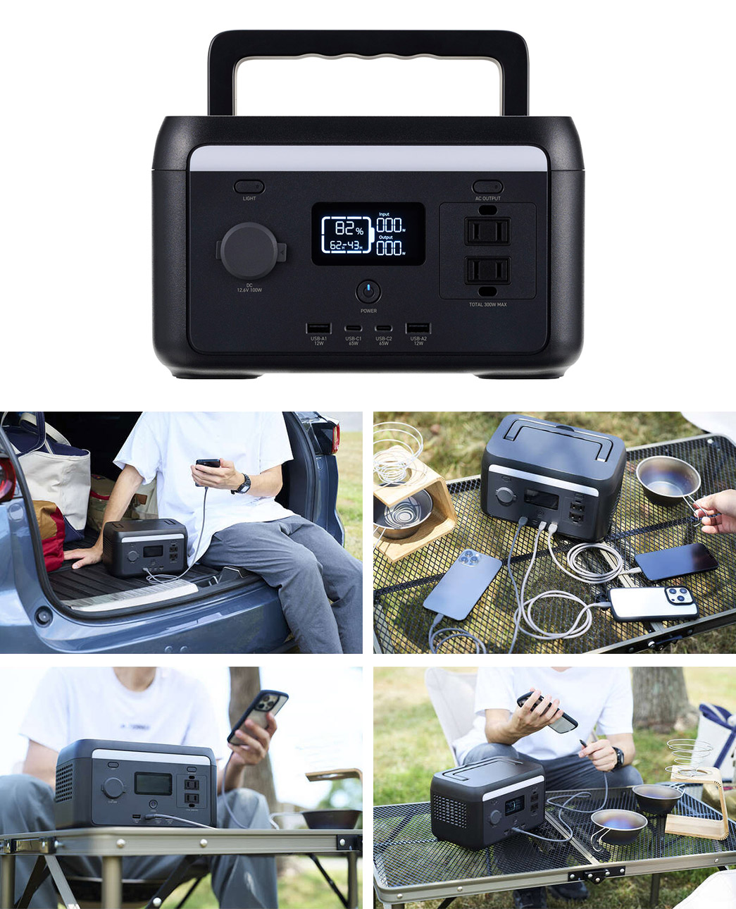 USB-A出力ポート、USB Type-C(TM)出力ポートをそれぞれ2口搭載しており、スマートフォンやタブレット、ノートパソコンの充電に最適。家族・友人などと同時に接続して複数台の充電を行えるモデルです。USB Type-C(TM)ポート、USB-Aポートのほか、ACコンセント、カーアクセサリーソケットを1口搭載しています。複数ポートを同時に接続しての利用が可能です。