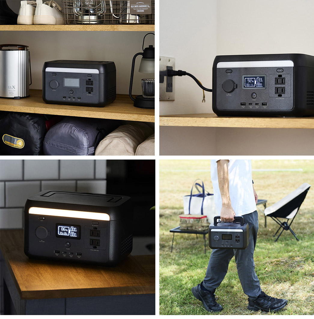| 連続使用可能時間(AC出力) | LEDライト(消費電力12W):約11.9時間、扇風機(消費電力35W):約4.7時間、ポータブル冷蔵庫(消費電力50W):約3.5時間、電気毛布(消費電力60W):約3.0時間、液晶テレビ(消費電力80W):約2.2時間、冷蔵庫(消費電力90W):約3.8時間、小型炊飯器(消費電力210W):約0.9時間 | |