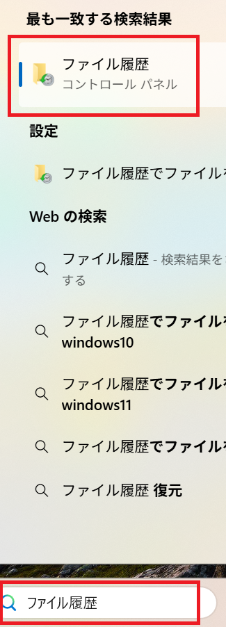 1.タスクバーの検索窓に「ファイル履歴」と入力し、検索結果に表示される「ファイル履歴」をクリックする