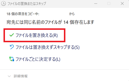 4.「宛先には同じ名前のファイルが〇個存在します」と表示されるので、「ファイルを置き換える」をクリックしたら完了
