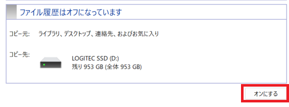 機能がオフになっている場合は、事前にファイル履歴の保存に使用する外付けストレージを接続したうえで、ファイル履歴画面にある「オンにする」ボタンをクリックしておきましょう。