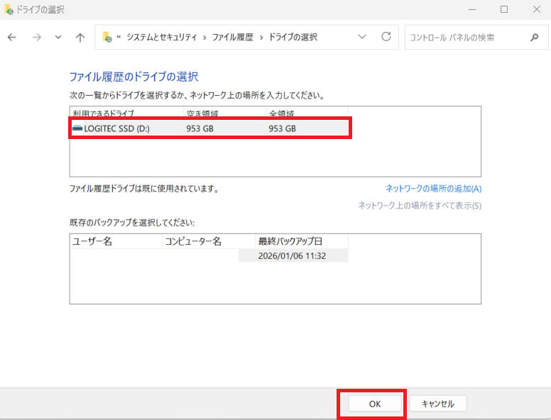 ただし、この機能もファイル履歴機能を有効にしていないと使うことができません。バックアップ先にするドライブを接続し、「ファイル履歴」→「ドライブの選択」→「バックアップ先となるドライブ」→「OK」の順にクリックして、あらかじめバックアップ先を設定しておきましょう。