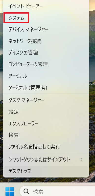 1.タスクバーのスタートボタンを右クリックして、「システム」をクリックする