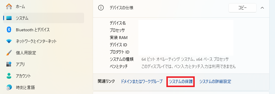 2.画面右側の下にある「システムの保護」を選択し、開いた画面で「システムの復元」をクリックする