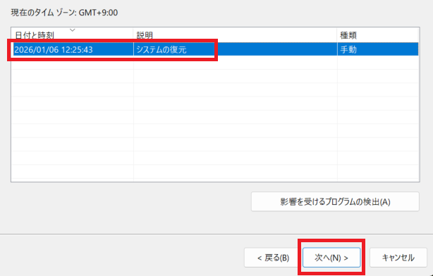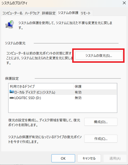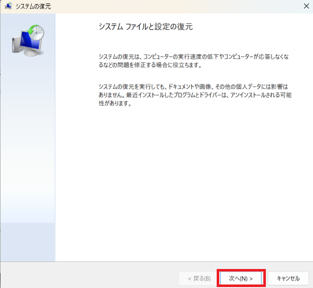 この方法では、復元ポイント以降に保存した内容(アプリやドライバーなど)が失われるため、注意が必要です。