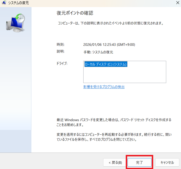 5.復元ポイントを確認して、問題がなければ「完了」をクリックする