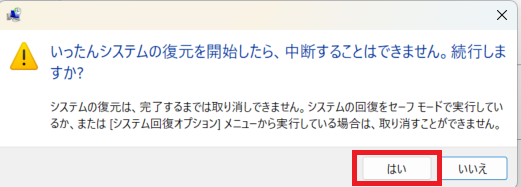 6.「いったんシステムの復元を開始したら、中断することはできません。続行しますか?」と表示されるので、「はい」をクリックする