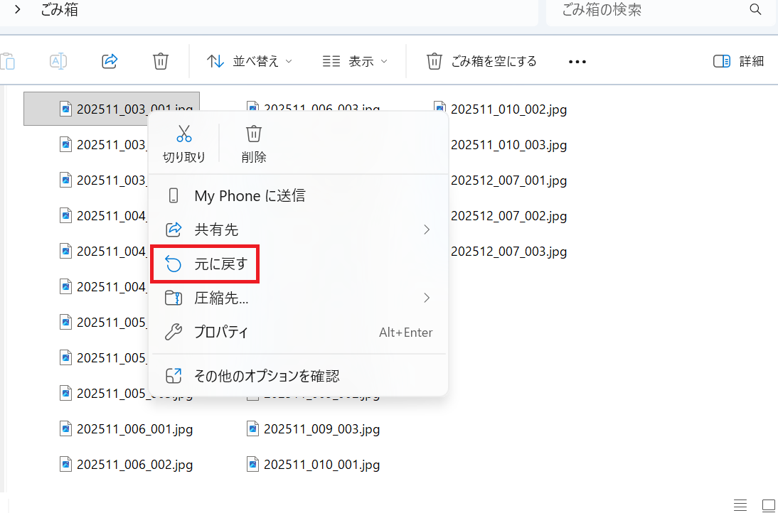 2.復元したいファイルを右クリックして「元に戻す」をクリックする