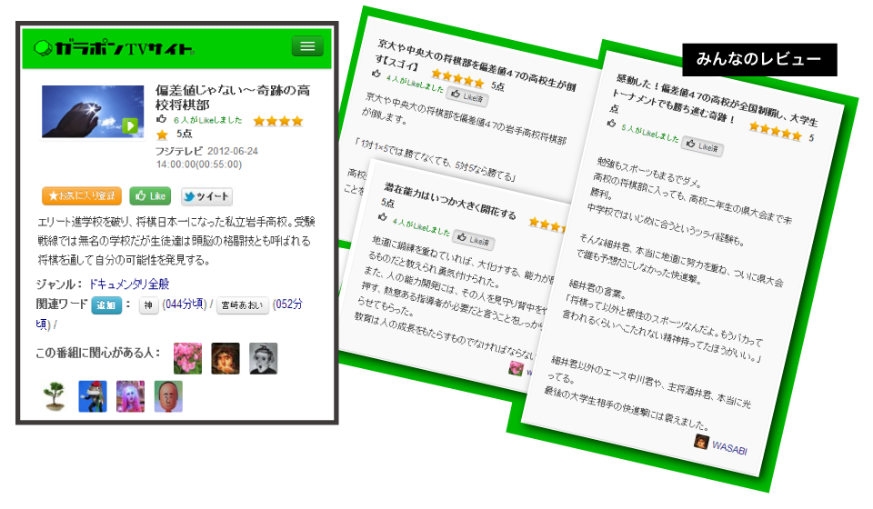 ガラポンTVユーザーによるテレビ番組レビューが見られるサイトで、レビューや評価の高い番組をチェックしてその場で試聴できます。