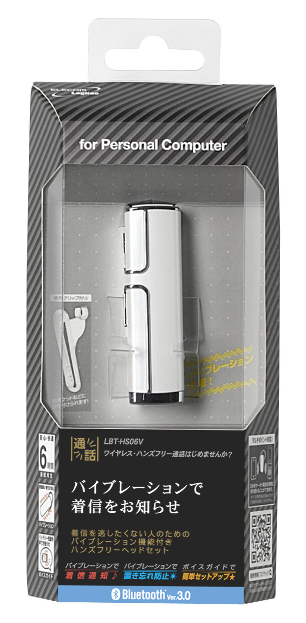 本製品はBluetooth®対応のスマートフォンや携帯電話、PCとワイヤレスで接続して会話が楽しめるヘッドセットです。バイブレーション機能を搭載しており、着信を受けるとヘッドセットが振動して通知します。ヘッドセットには、取り外し可能なクリップを付属しています。スマートフォンや携帯電話をカバンなどに入れていても、ヘッドセットをクリップでポケットに装着しておけば着信を逃すことがありません。
