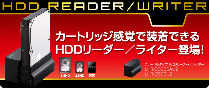 「LHR-DS03シリーズ」は、2.5型、3.5型のSATA HDD、SSDをカートリッジ感覚で装着できるHDDリーダー/ライターです。