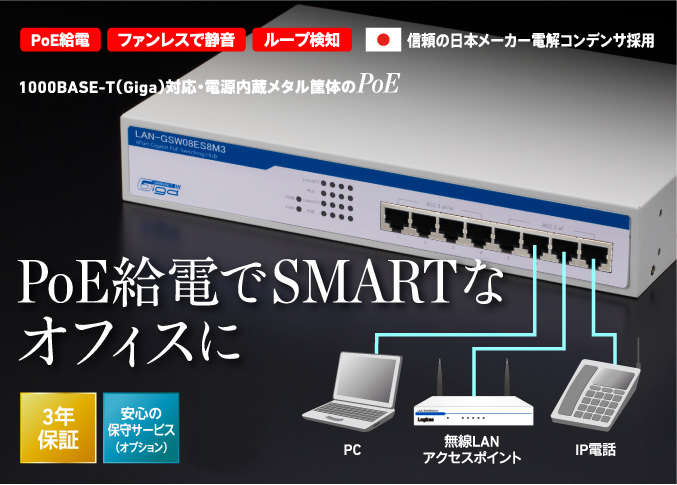 | LAN-GSW08ES8M3A | 法人用/ギガビットPOE HUB | 4992072063754 | ¥24,800(税別) | 8ポート/電源内蔵/メタル/40度対応/3年保証対応 |