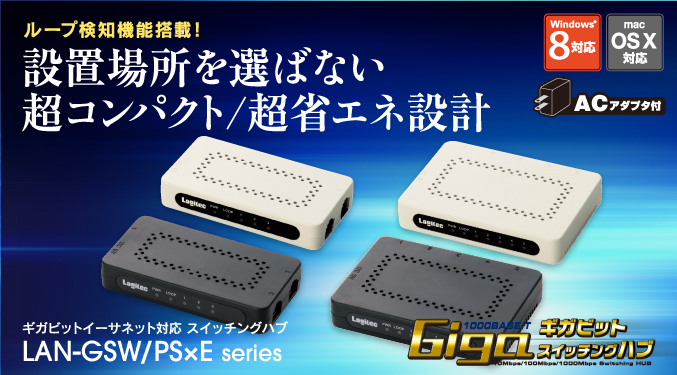 | 型番/カラー | LAN-GSW03PSBE 3ポート/ブラック LAN-GSW03PSWE 3ポート/ホワイト LAN-GSW05PSBE 5ポート/ブラック LAN-GSW05PSWE 5ポート/ホワイト |
