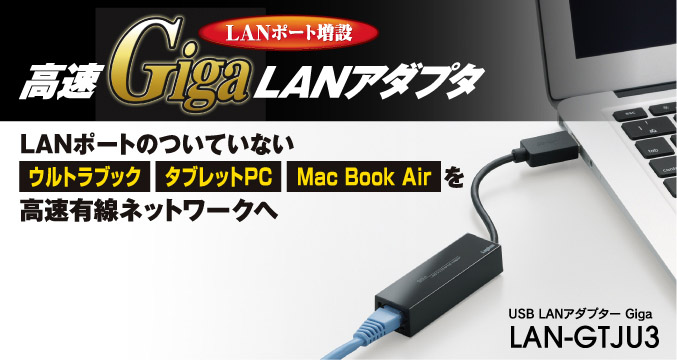 USBポートに接続するだけで、LANポートのついてないウルトラブック、タブレットPC、Mac book Airを高速有線1000Mbpsネットワーク接続化することができる製品です。