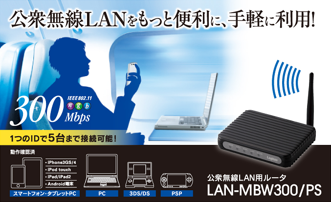 | LAN-MBW300/PS | 公衆無線LAN対応ルータ | 4992072054073 | ¥5,300(税別) | IEEE802.11n/g/b、USB給電、300Mbps |