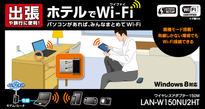 | LAN-W150NU2HT | ワイヤレスアダプタ 150M(出張・旅行ホテル向け) | 4992072064089 | ¥1,450 (税別) | ニュースリリース |
