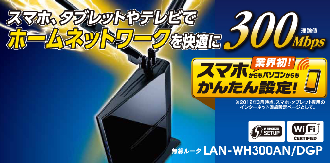 | LAN-WH300AN/DGP | スマートフォン/タブレット端末専用の設定機能を搭載 | 4992072059764 | 9,280(税別) |