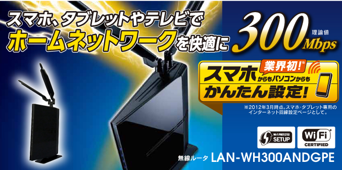 | LAN-WH300ANDGPE | 11n/a/b/g 300Mbps ギガルータ | 4992072065161 | 12,600(税込) |