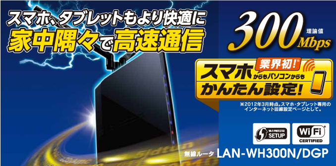| LAN-WH300N/DGP | スマートフォン/タブレット端末専用の設定機能を搭載 | 4992072059825 | 6,960(税別) |