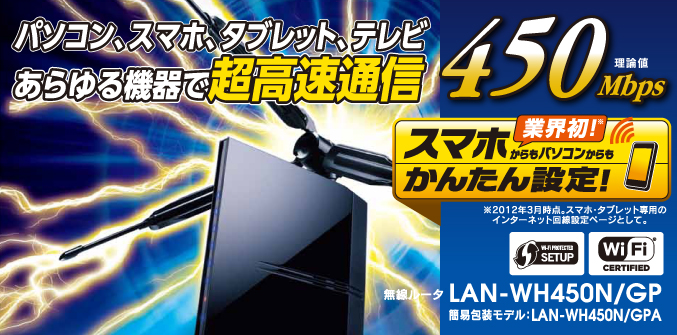 | LAN-WH450N/GP | スマートフォン/タブレット端末専用の設定機能を搭載 | 4992072059795 | 11,400(税別) |