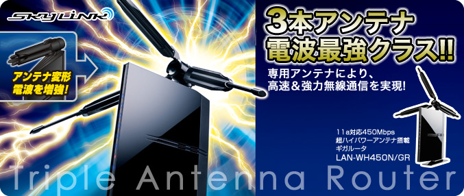 業界最速! 従来の無線LANの1.5倍「450Mbps」※(2011年3月現在)という超高速通信を実現3本のアンテナで受信/送信を行うことで、最大450Mbpsの超高速データ転送を可能にしました。 ![]() |