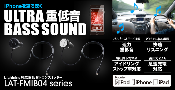 本製品は、Lightningコネクタ搭載のiPhone,iPad,iPod用シガーソケット直結タイプのFMトランスミッターです。iPhone6などに直結できるLightningコネクタを搭載していますのでつなぐだけで音楽再生と充電が可能です。また、iPadやiPhone6,iPhone6 Plusの急速充電にも対応しています。音楽だけでなく、ナビアプリや動画コンテンツの音声をFMカーステレオで聴くことができます。