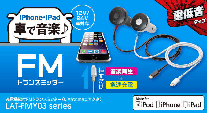 iPhoneやiPad、iPodにLightningコネクタを挿しこむだけの簡単接続で、音楽再生と急速充電が同時にできるFMトランスミッターです。音楽だけでなく、ナビアプリや動画コンテンツの音声をFMカーステレオで聴くことができます。iPhoneなどに直結できるLightningコネクタを搭載していますのでつなぐだけで音楽再生と充電が可能です。