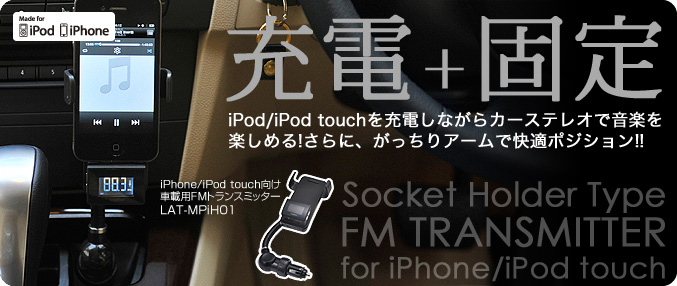 LAT-MPiH01は、iPhone/iPod touchの音楽をカーステレオのFMラジオを通じて楽しむことのできる、FMトランスミッターです。