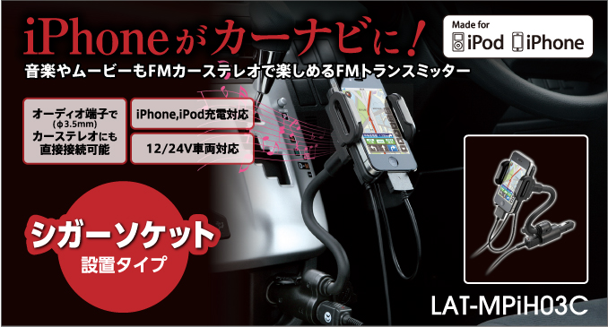 | LAT-MPiH03C | FMトランスミッター内蔵iPhone/iPodホルダー、シガーソケット設置 | 4992072056084 | オープン | 販売終了 | |||