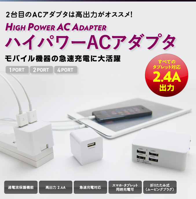 - 2.4AまでのUSB充電に対応するスマートフォン、タブレット端末