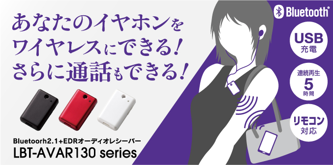 「LBT-AVAR130シリーズ」はBluetooth®を使って、音楽プレーヤーや携帯電話、スマートフォン※(※Bluetooth®対応A2DPプロファイルに対応している機種)の音楽をワイヤレスで楽しむことができるステレオオーディオレシーバーです。 お手持ちのヘッドホン、イヤホンを接続し、Bluetooth対応のスマートフォンや携帯電話、携帯音楽プレーヤーなどとワイヤレスで接続でき、プレーヤーをかばんやポケットにいれたままでも快適に、高音質な音楽を楽しむことができます。