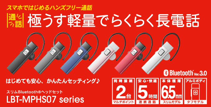 | LBT-MPHS07BU | スリムBluetoothヘッドセット | 4992072063648 | ¥2,180(税別) | ブルー |