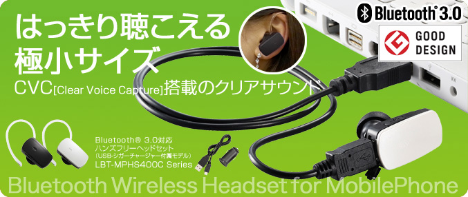 LBT-HS400シリーズはBluetoothバージョン3.0規格に対応した超小型のハンズフリーヘッドセットです。 |