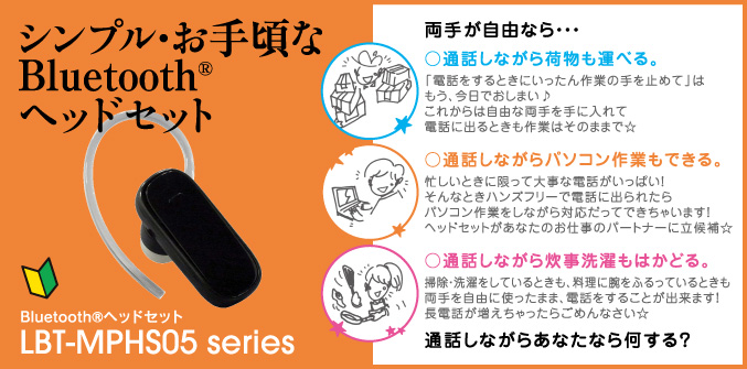 | LBT-MPHS05BK | シンプルでお手頃なBluetoothヘッドセット ブラック | 4992072061071 | オープン | 販売終了 |