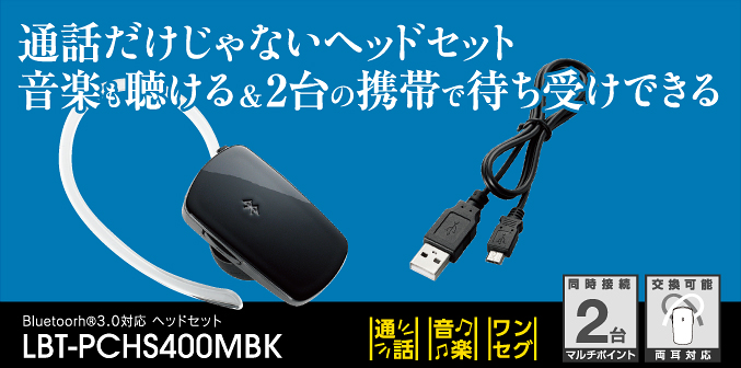 | LBT-PCHS400MBK | Bluetooth3.0ヘッドセット/USB充電ケーブル付き | 4992072058187 | オープン | ブラック、モノラル音楽対応 | |