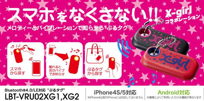 | LBT-VRU02XG1 | Bluetooth4.0対応”ぶるタグ”X-girlコラボレーションモデル | 4992072061989 | ¥3,600(税別) | ブラック/ピンク |