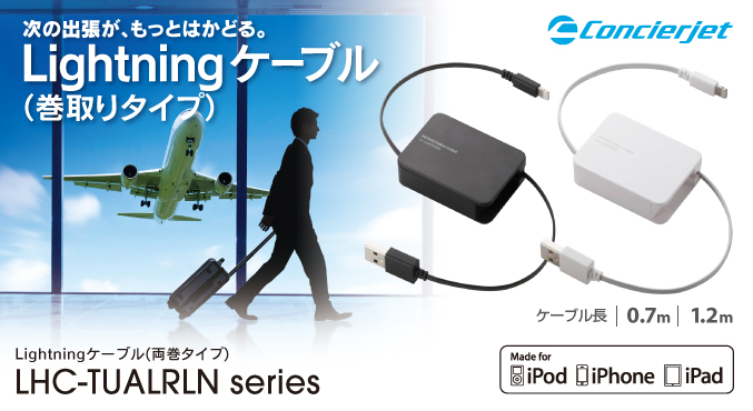 出張者や旅行者のニーズを細かくサポートする“Concierjet(コンシェルジェット)”シリーズです。本製品はiPhoneやiPod、iPadなどのLightningコネクタ搭載機器とパソコンやAC充電器のUSBポートを接続し、充電・データ転送が可能なLightningケーブルです(※)。Apple社製品に対応したUSBポート付きの充電器との接続で家庭用コンセントからの充電もできます。