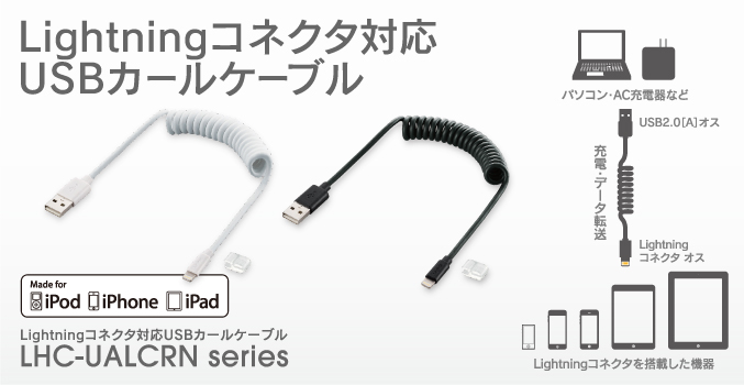 USB(Aタイプ)のインターフェースを持つシガーチャージャーやAC充電器、パソコンに、Lightningコネクタを持つiPhoneやiPod、iPadを接続し、充電やデータ転送ができ、必要な時だけ長く伸びるカールケーブルタイプです。