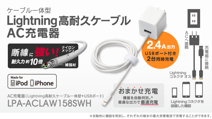 | LPA-ACLAW158SWH | AC充電器 (Lightning高耐久ケーブル一体型+USBポート) |