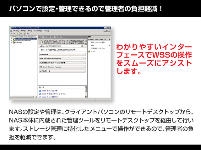NASの設定や管理は、クライアントパソコンのリモートデスクトップから、NAS本体に内蔵された管理ツールをリモートデスクトップを経由して行います。ストレージ管理に特化したメニューで操作ができるので、管理者の負担を軽減できます。