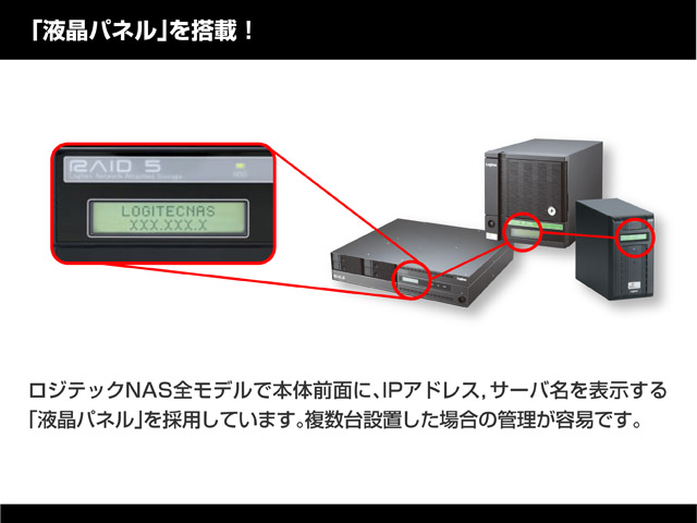 | そのほかの機能 | * 共有フォルダへのアクセス権限設定 * ユーザーパスワード設定/変更 * 状況/障害通知機能(E-mail) * 障害警報機能(E-Mail/BEEP/LCD):RAIDエラー等 |