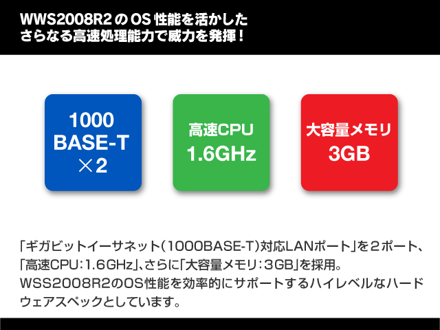 | 対応ファイルシステム | ・CIFS(SMB1.0):Windows環境 ・AFP :Macintosh環境 AFP2.0サポート※ ・FTP :Windows環境/Macintosh環境※ ・NFS :Linux環境 ※ ※出荷時デフォルト共有フォルダでは有効になっておりません。 |