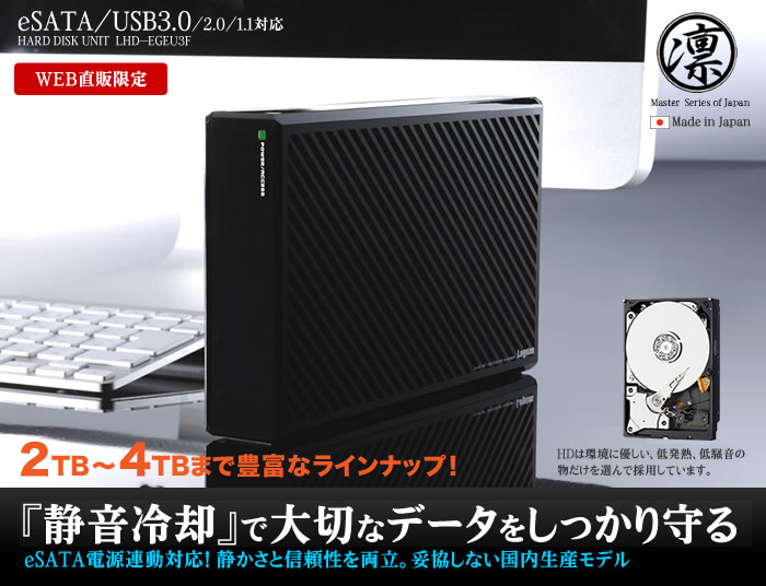 | LHD-EG3000EU3F | FAN搭載 USB3.0&eSATA対応ハードディスク | 4580333541563 | オープン | 3TB ※WindowsXP非対応です。 |