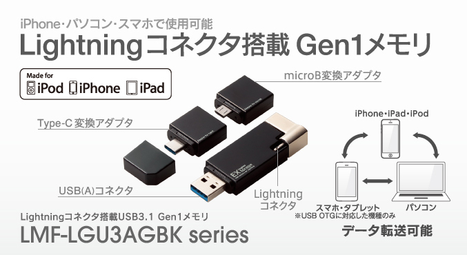 | コネクタ形状 | USBメモリ本体:USB [A] オス⇔Lightningコネクタ オス 変換アダプタ:USB [A] メス⇔USB[microB] オス、USB[A] メス⇔USB typeC オス |