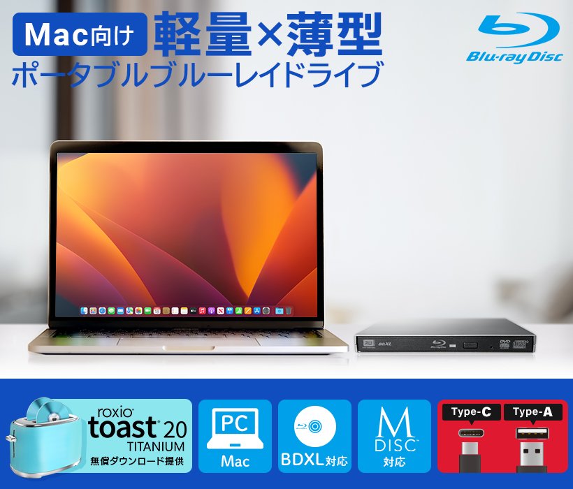 薄型軽量ノートPCにぴったりな薄さ14mm、重さ230gで「超薄・超軽量」のポータブルブルーレイドライブです。MacBook Airなど光学ドライブ非搭載のパソコンで必要な時だけブルーレイドライブを使用できるので便利です。トップカバーにはApple製品と合うスペースグレイを採用。Macで高画質な動画ファイルの編集や、ブルーレイディスクに大容量データを書き込む事ができる人気のメディア管理ソフト「Toast20」※を付属しており、Macユーザーにおすすめです。