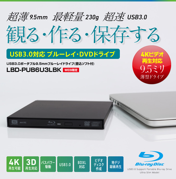 | LBD-PUB6U3VBK | USB3.0ポータブル9.5mmBD編集再生書込ソフト付き | 4580333556079 | ¥13,200(税込) | ニュースリリース |