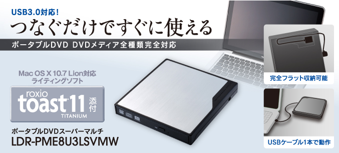 | LDR-PME8U3LSVMW | 台数限定300台 USB3.0対応ポータブルDVD/トレイ | 4580333543482 | オープン | Mac OS X 10.7対応ソフト付き、シルバー |