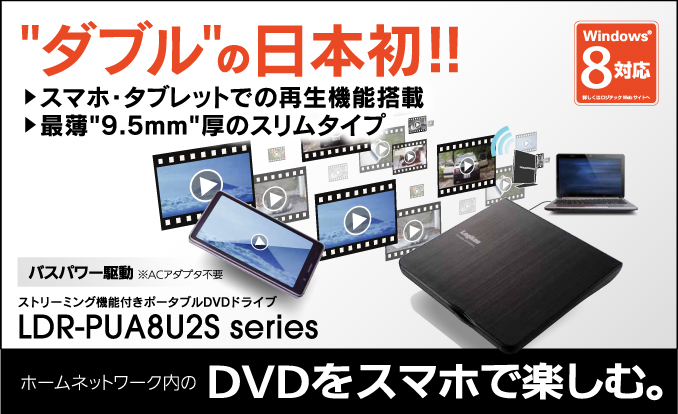 LDR-PUA8U2SBK ストリーミング機能付きポータブルDVDドライブ(ブラック) 4580333550930 ¥5,850(税別) ニュースリリース