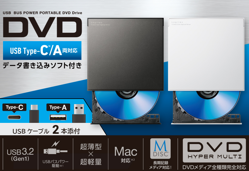 | LDR-PWA8U3CLBK | USB Type-A(USB-A)/USB Type-C™(USB-C™)対応 書き込みソフト付きUSB3.2(Gen1) ポータブルDVDドライブ |