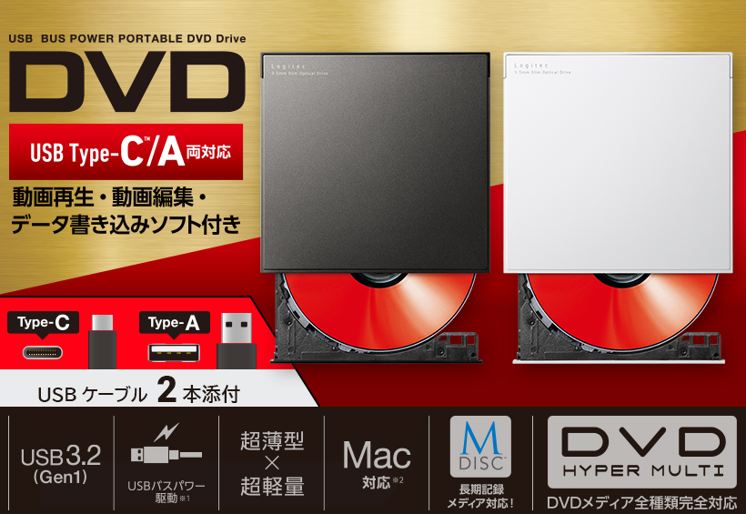 | LDR-PWA8U3CVBK | USB Type-A(USB-A)/USB Type-C™(USB-C™)対応 動画再生・データ保存・動画/写真編集ソフト付きUSB3.2 (Gen1) ポータブルDVD |